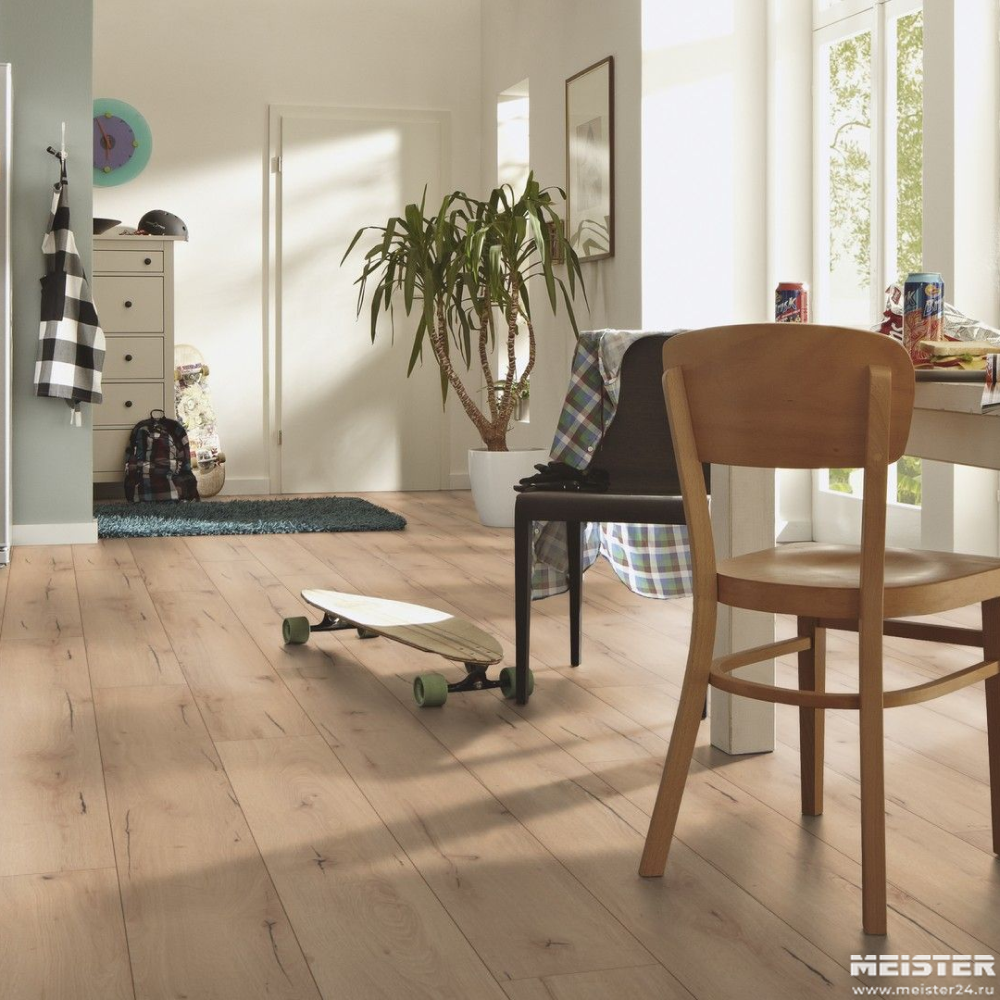 Коллекция Meister LL150 отличается своей эстетической привлекательностью и разнообразием дизайнов. Ламинат имеет однополосный формат доски с глубоким тиснением поверхности, которое создаёт ощущение натуральности и уюта. Цветовая палитра представлена в натуральном оттенке дуба, что позволяет гармонично вписать покрытие в любой интерьер. Особенностью данной модели является 4-сторонняя фаска, которая придаёт доскам элегантный вид и подчёркивает их индивидуальность. Формат доски — длинная широкая доска, что способствует созданию визуально просторного и стильного пространства.