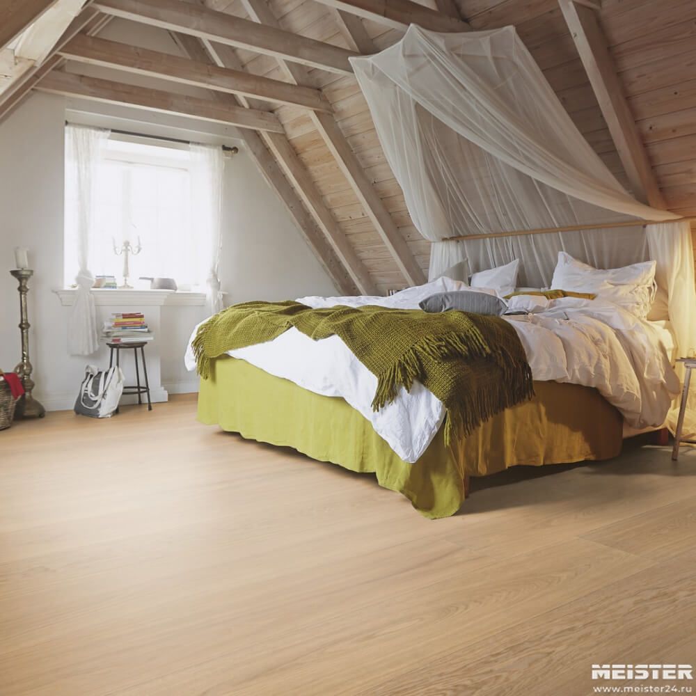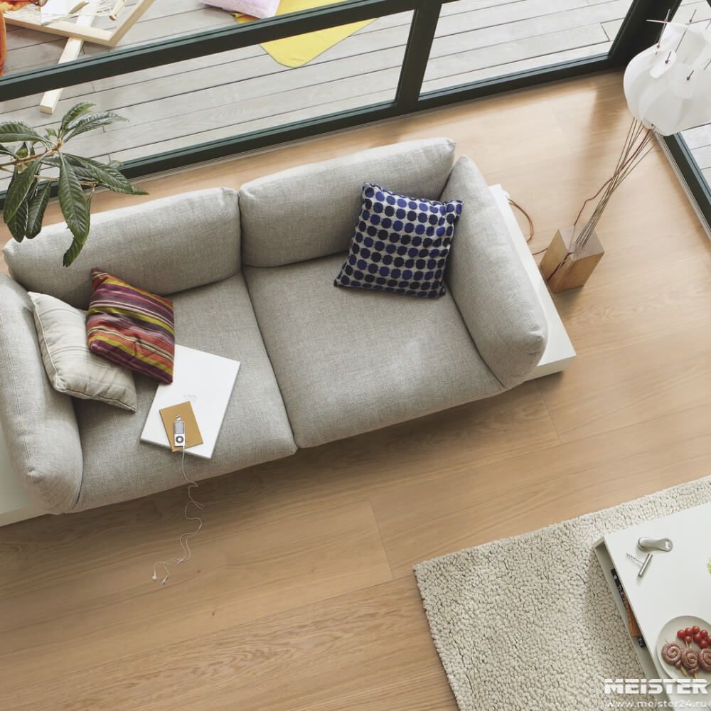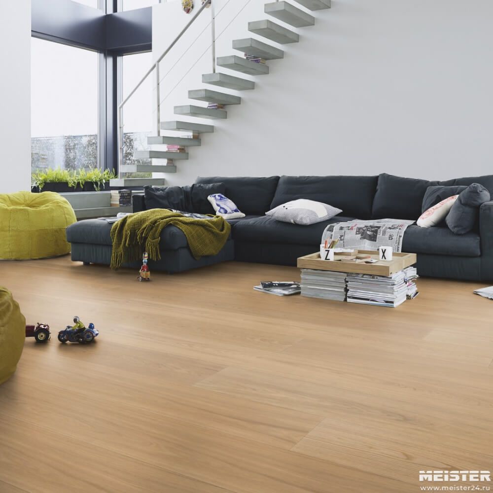 Паркетная доска Meister Дуб Натур Чистый 8906 — прочное, практичное напольное покрытие премиум-класса в формате широкой длинной доски темно-коричневого оттенка. Фаска по длинной стороне доски в сочетании с фаской на короткой помогает увеличивать визуально пространство.